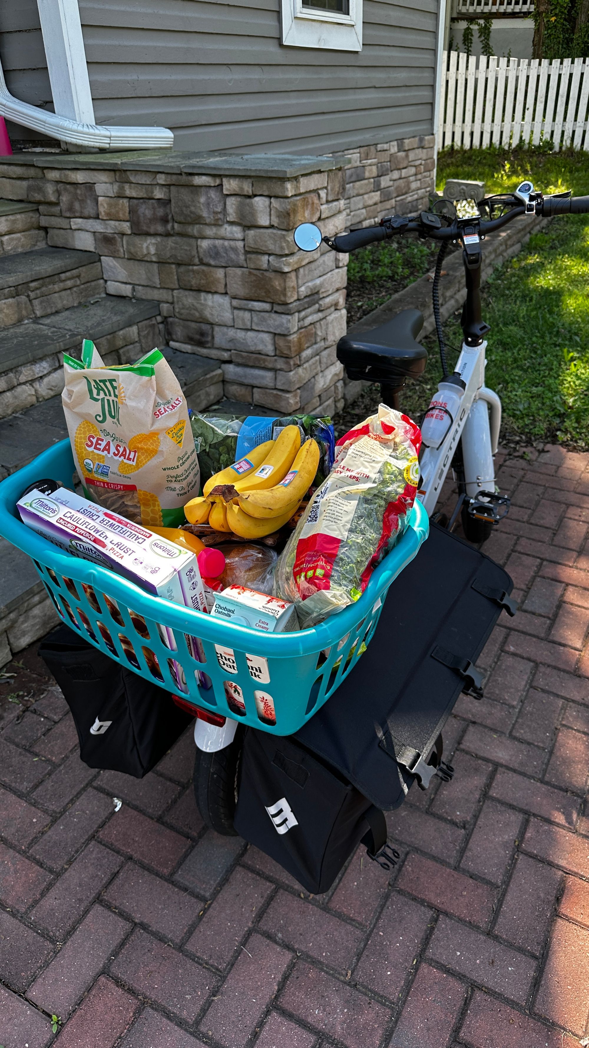 Grocery shopping was something I already did on my regular commuter bike. The smaller panniers allowed me to get a couple of essentials on each side which meant I was making smaller trips more often. Most big trips were done with Mom’s car or with my roommate in his car. I’ve taken the e-bike on a couple of big grocery trips in the last month. Did I make the run in less than 12 parsecs? Not quite. But the 6-mile ride through downtown to the Durham Co-Op and Harris Teeter couldn’t have taken much longer than driving, and with the pedal assist, I could hardly feel the additional 27 pounds hanging off the rear of the bike. We don’t have a ramp at the house yet, so I had to unload the bags before deadlifting the bike onto the porch. I did say the bike was great for exercise…